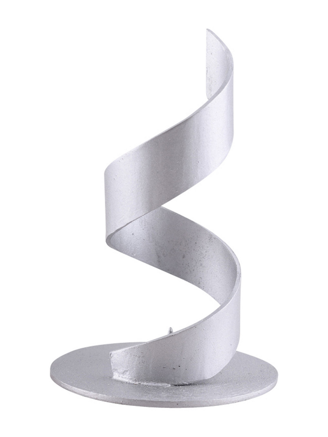The candle holder is matt silver and made of aluminum. The candle holder has a spiral design. The base of the candle holder has a diameter of 7.5 cm. Its height is 12 cm.