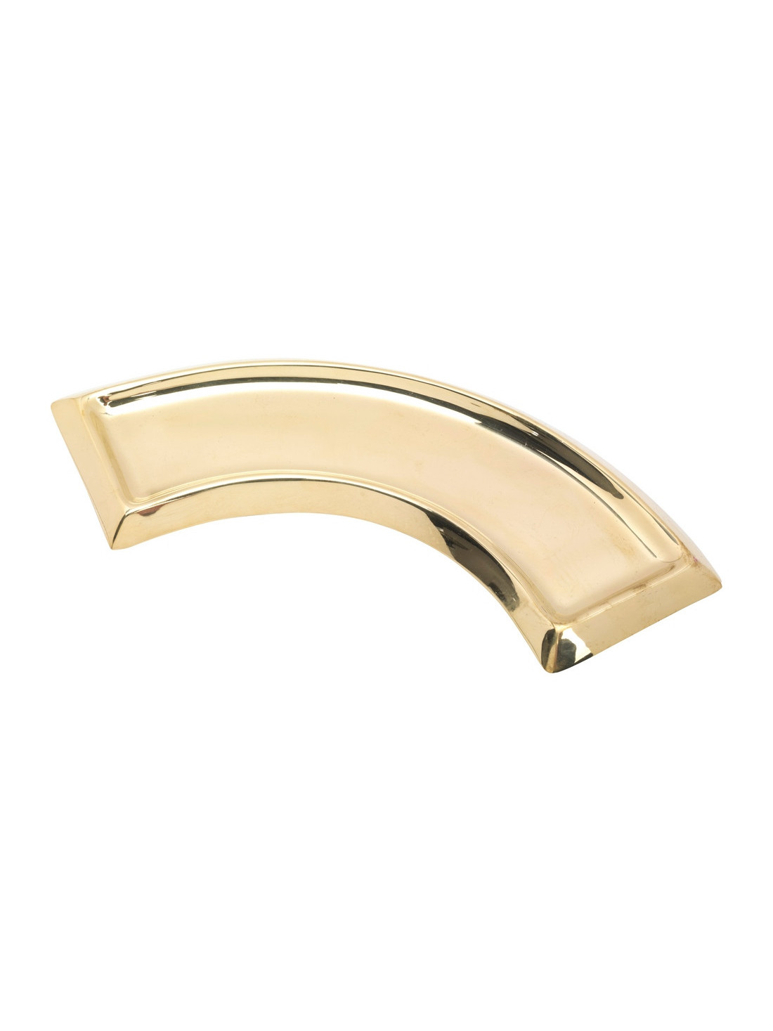 The candle plate is made of brass, gold colored and polished. It is semicircular. Its length is 26 cm and its width is 8 cm. The thickness of the plate is 0.5 cm. The surface is smooth.