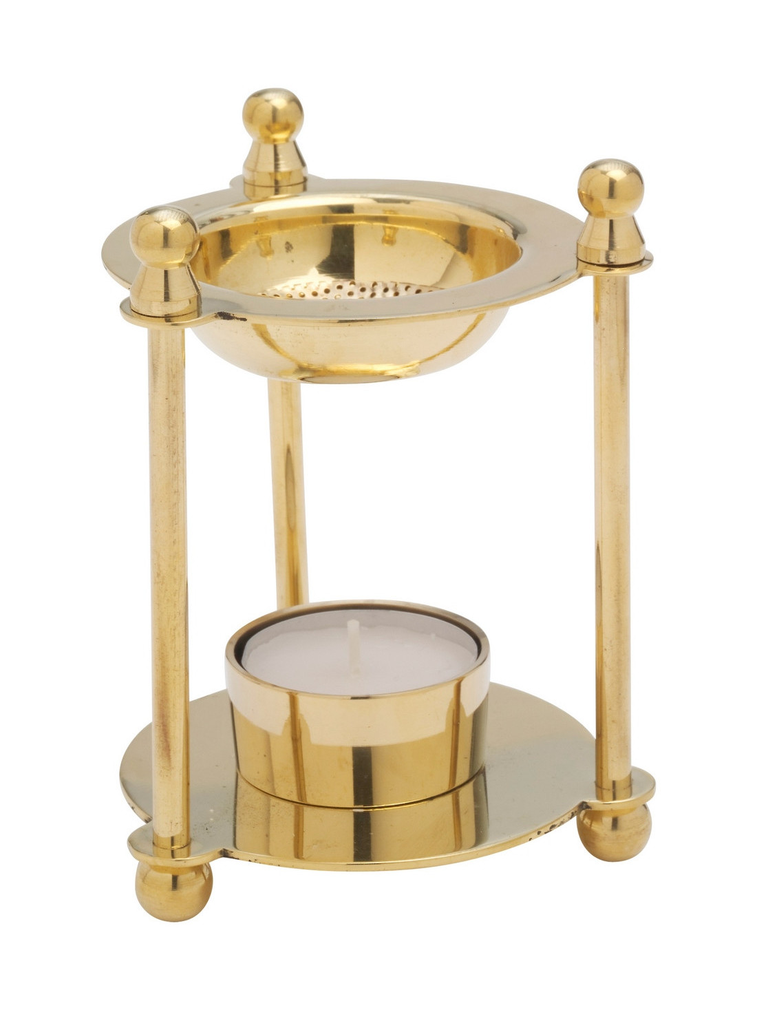 The incense burner is made of brass and gold-plated. The height of the incense burner is 12 cm. Its top diameter is 8 cm and the diameter of its foot is 8 cm. The incense burner has 3 pillars and a tea light fits on the lower plate.