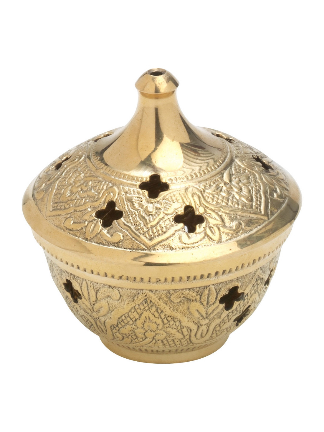 The incense bowl is made of brass and is gold colored. The height of the bowl is 6.5 cm. Their diameter is 7 cm. Fine patterns are worked into the surface. A coal screen is included in the scope of delivery.