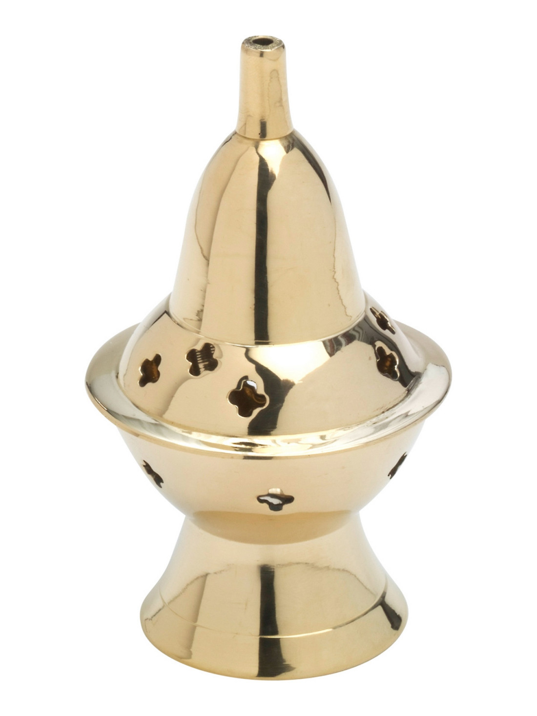 The incense bowl is made of brass and is gold colored. The height of the bowl is 10 cm and its diameter is 7 cm. Small crosses are worked into the surface.