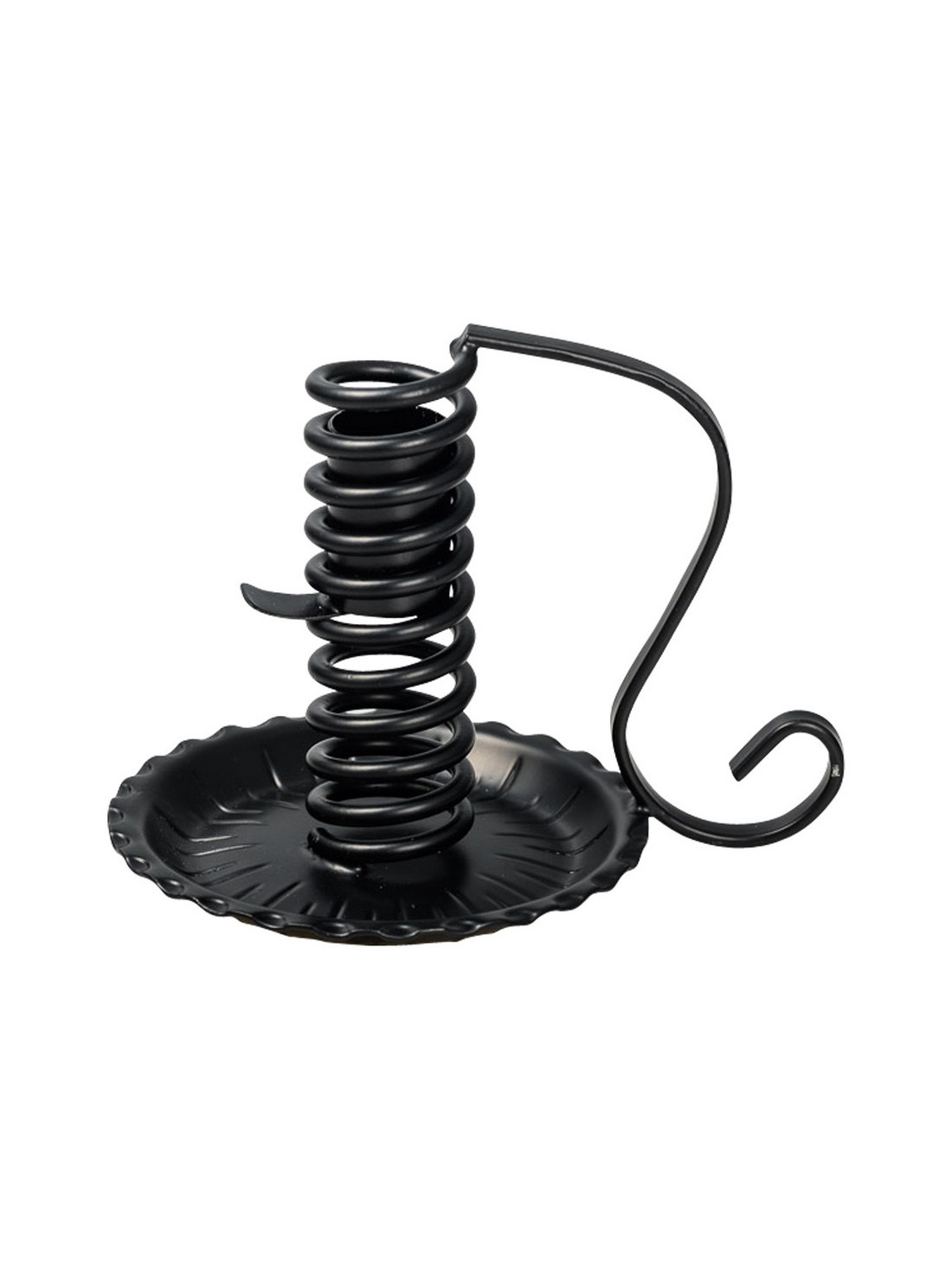 The spiral chandelier is made of iron and is black in color. The height of the chandelier is 12 cm and the diameter of its base is 12 cm. Fine lines are worked into the surface. The body to hold the candle is made in a spiral shape. A candle with a diameter of 2-2.5 cm is suitable for use.