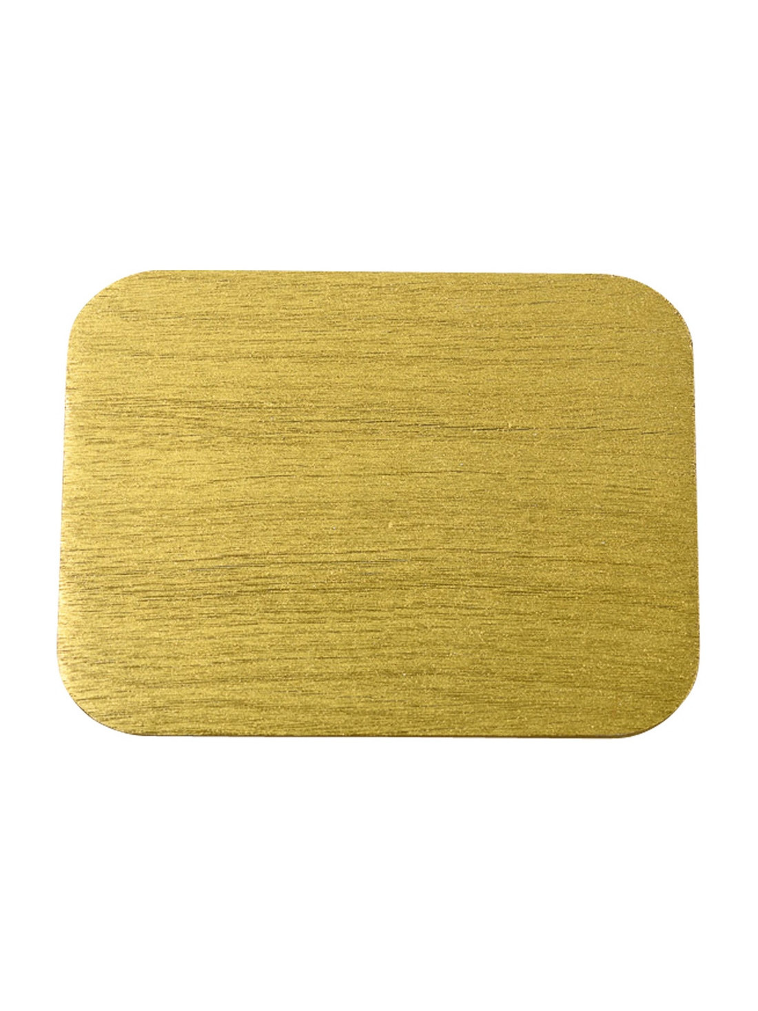 The candle plate is made of aluminum and is gold colored. The shape is rectangular. Its length is 10 cm and its width is 8 cm. The thickness of the plate is 0.5 cm. The golden surface is brushed. The underside is provided with felt gliders.